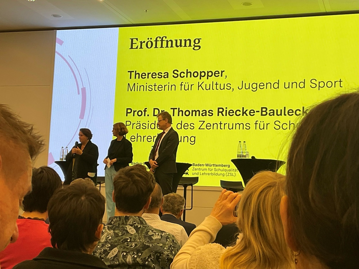 Eröffnet wurde der Tag mit Impulsen zur Demokratie von Schülerinnen und Schülern. Ein anschließender Austausch zum Thema Demokratiebildung in der Schule fand mit prominenten Gästen statt. Die Ministerin Theresa Schopper und Prof. Dr. Thomas Riecke-Baulecke, Präsident des Zentrums für Schulqualität und Lehrerbildung, sowie Schulleiter*innen verschiedene Schulen, die bereits Demokratiebildung fest verankert haben, tauschten sich aus, beantworteten Schülerfragen und motivierten die Anwesenden mit erfolgreichen Beispielen aus der Praxis und diskutierten, wie Schulen Demokratie aktiv leben können.