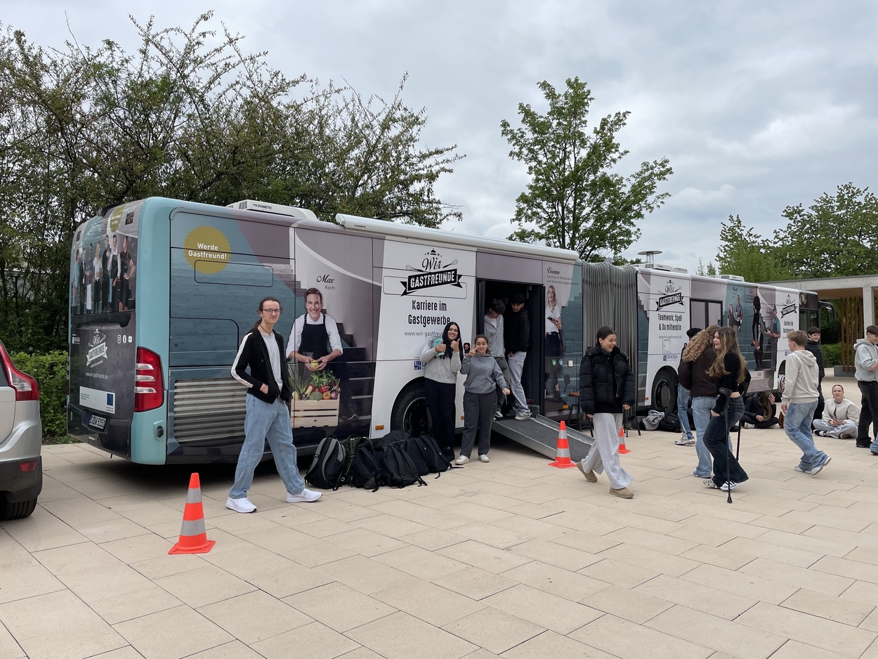 Vergangenen Mittwoch waren einige Schüler der Klassen R9 und W8 im Gastromobil, welches an der Ruth-Cohn-Schule Station gemacht hat, wo uns Berufe aus der Gastronomie/Hotellerie vorgestellt wurden. Zuerst wurden wir in zwei Gruppen aufgeteilt und gingen in verschiedene Bereiche des Busses. In meiner Gruppe waren wir zuerst im vorderen Teil des Busses, wo wir uns an festen Tablets ein Gericht aussuchen und für dieses die Zutaten herausfinden sollten. Außerdem bekamen wir Kopfhörer, die wir dann auch behalten durften für eine Hotelrezeptionssimulation: Auf einem Bildschirm kamen „Gäste“ auf uns zu mit Problemen; bspw. eine kurzfristige, außerplanmäßige Abreise aus dem Hotel, bei denen wir den „Gästen“ dann helfen sollten. Anschließend sollten wir Gewürze anhand ihres Geruches erkennen, außerdem war eine weitere Aufgabe herauszufinden, was die Hauptbestandteile von verschiedenen Getränken sind.Danach gingen wir in den hinteren Teil des Busses, wo wir zuerst sagen sollten, ob wir schon wissen, was wir mal werden wollen. Die meisten wussten es schon, aber nicht alle. Dann wurden uns Videos von verschiedenen Auszubildenden gezeigt: