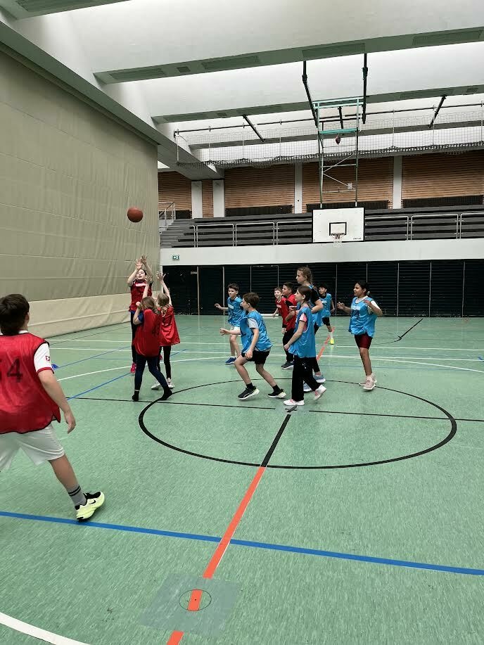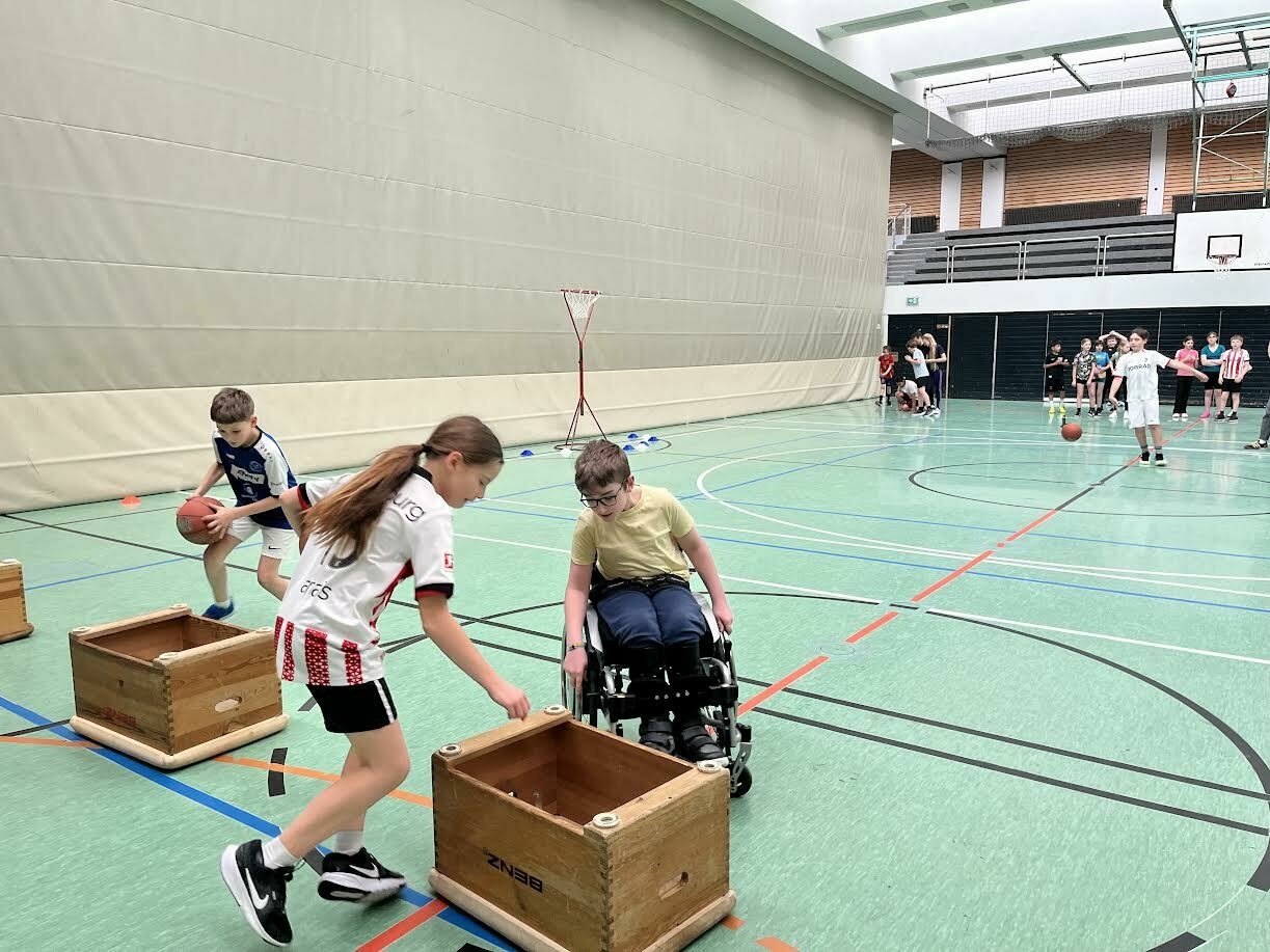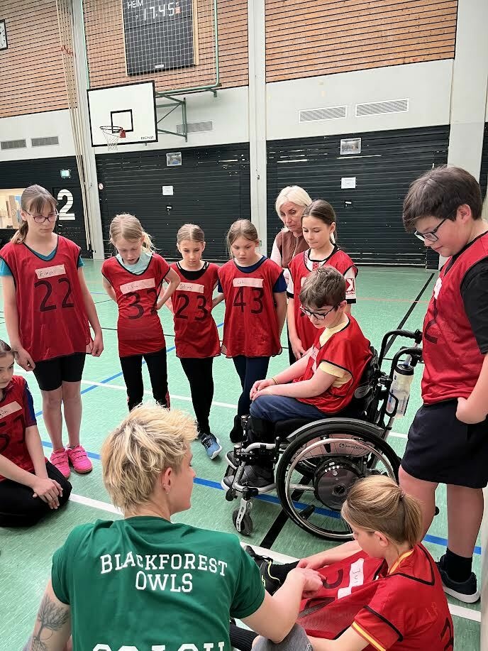 Am 15. und 22.4. bekam die Klasse R5b im Sportunterricht Besuch von Madita, Mila und Elise, die für das Team der „Blackforest Owls“ Baskin spielen. Nach dem Aufwärmen erklärten sie zunächst die Spielregeln:Baskin ist eine inklusive Variante von Basketball, die so gestaltet ist, dass Menschen mit und ohne Behinderung gemeinsam in einem Team spielen können.