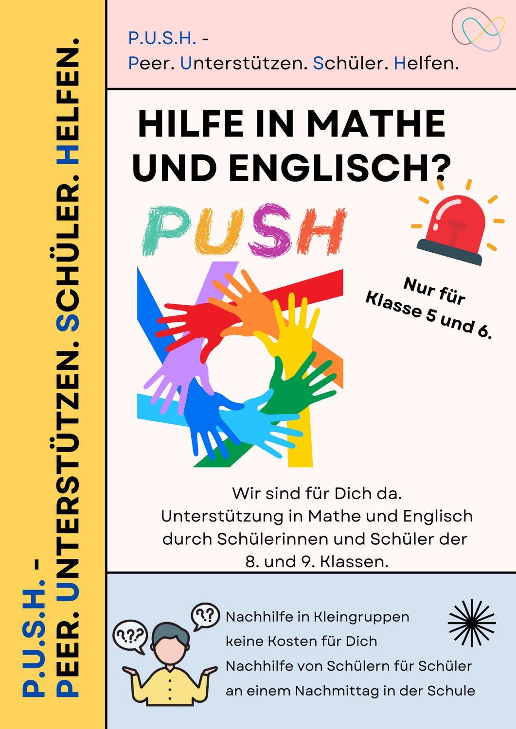 Peer. Unterstützung. Schüler. Helfen. – Nachhilfe für die Klassen 5 und 6Mit P.U.S.H. bietet die Ruth-Cohn-Schule ein unterstützendes Nachhilfeangebot in Mathematik und Englisch für die 5. und 6. Klassen. Der Unterricht findet in kleinen Gruppen statt und wird von speziell geschulten Schülerinnen und Schülern höherer Jahrgänge durchgeführt. Ziel ist es, Lerninhalte zu üben, zu vertiefen und mögliche Lücken zu schließen.