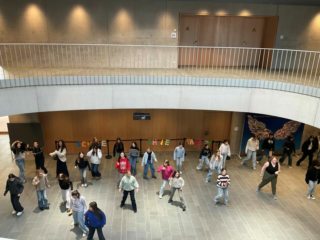 Getanzt wird in unserem neuen Foyer im Erdgeschoss. Treffpunkt ist immer zu Beginn der Pause. In diesem Schuljahr findet die Pause am Montag in der ersten und am Donnerstag in der zweiten Pause statt.