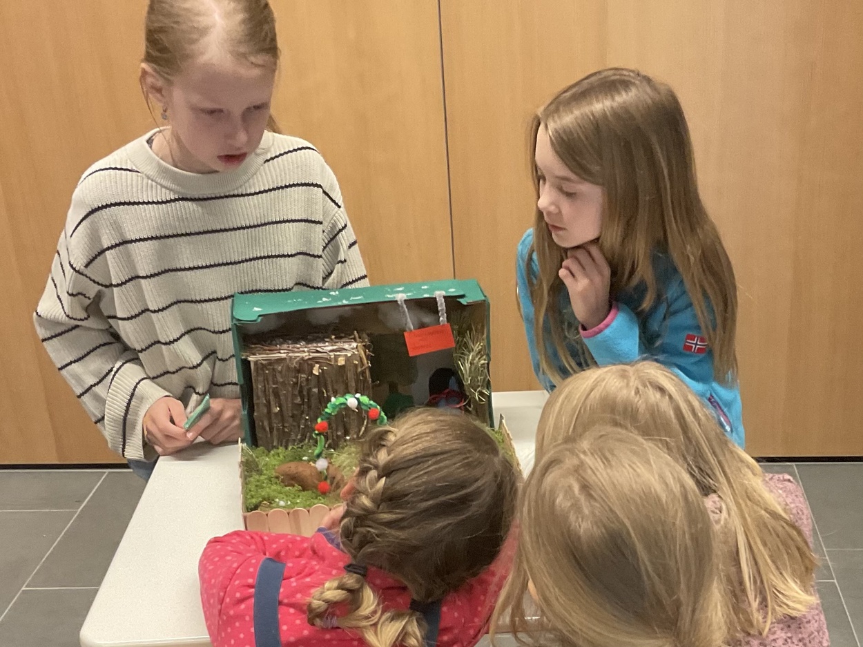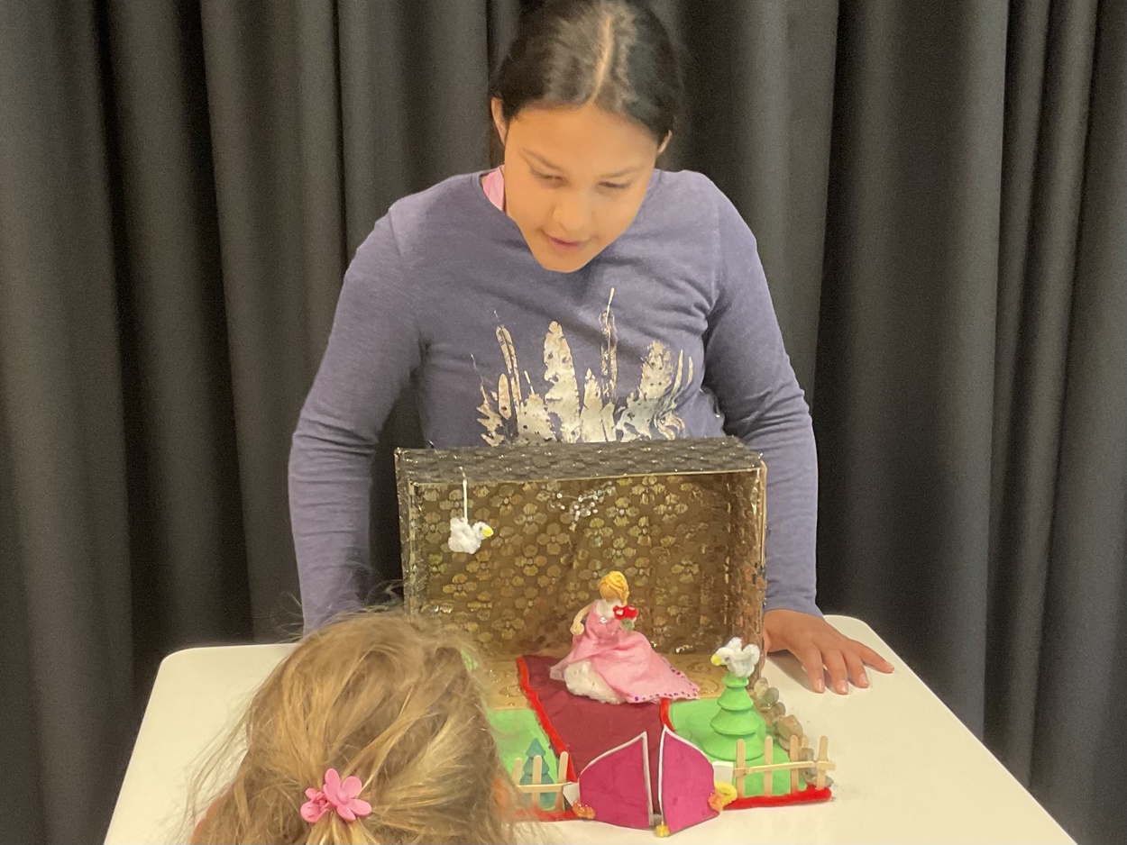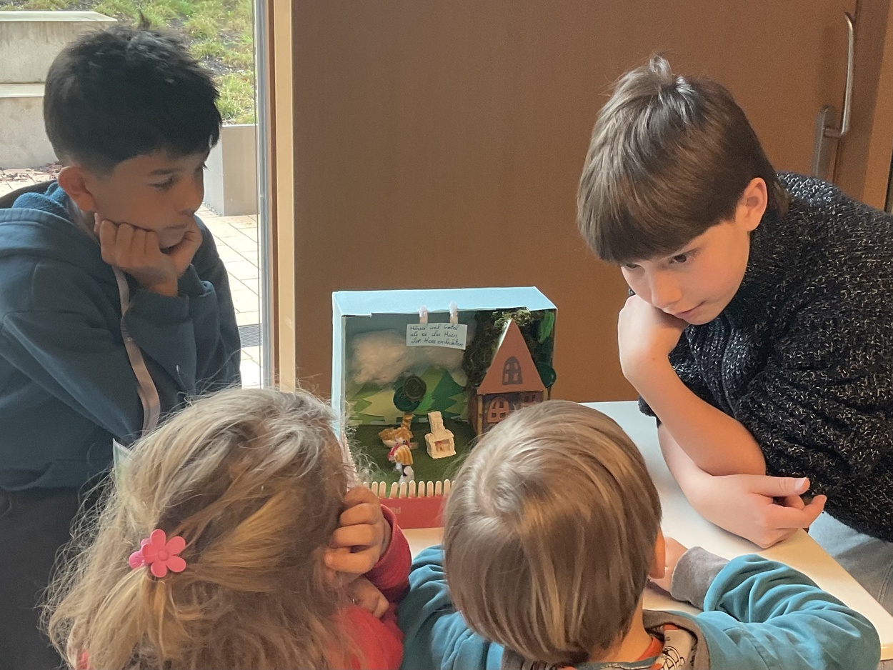 In der Aula der Schule wurden die liebevoll gestalteten Märchenkartons präsentiert. Die Schülerinnen und Schüler stellten ihre Werke stolz vor und gaben den jungen Gästen spannende Einblicke in ihre kreativen Arbeiten.