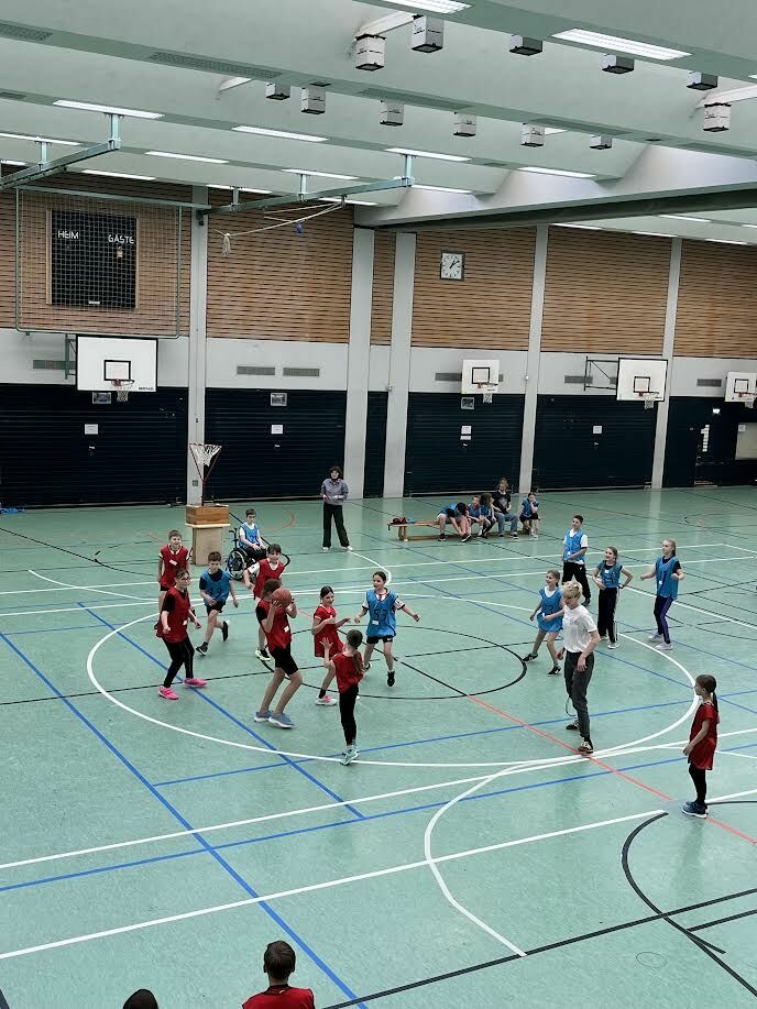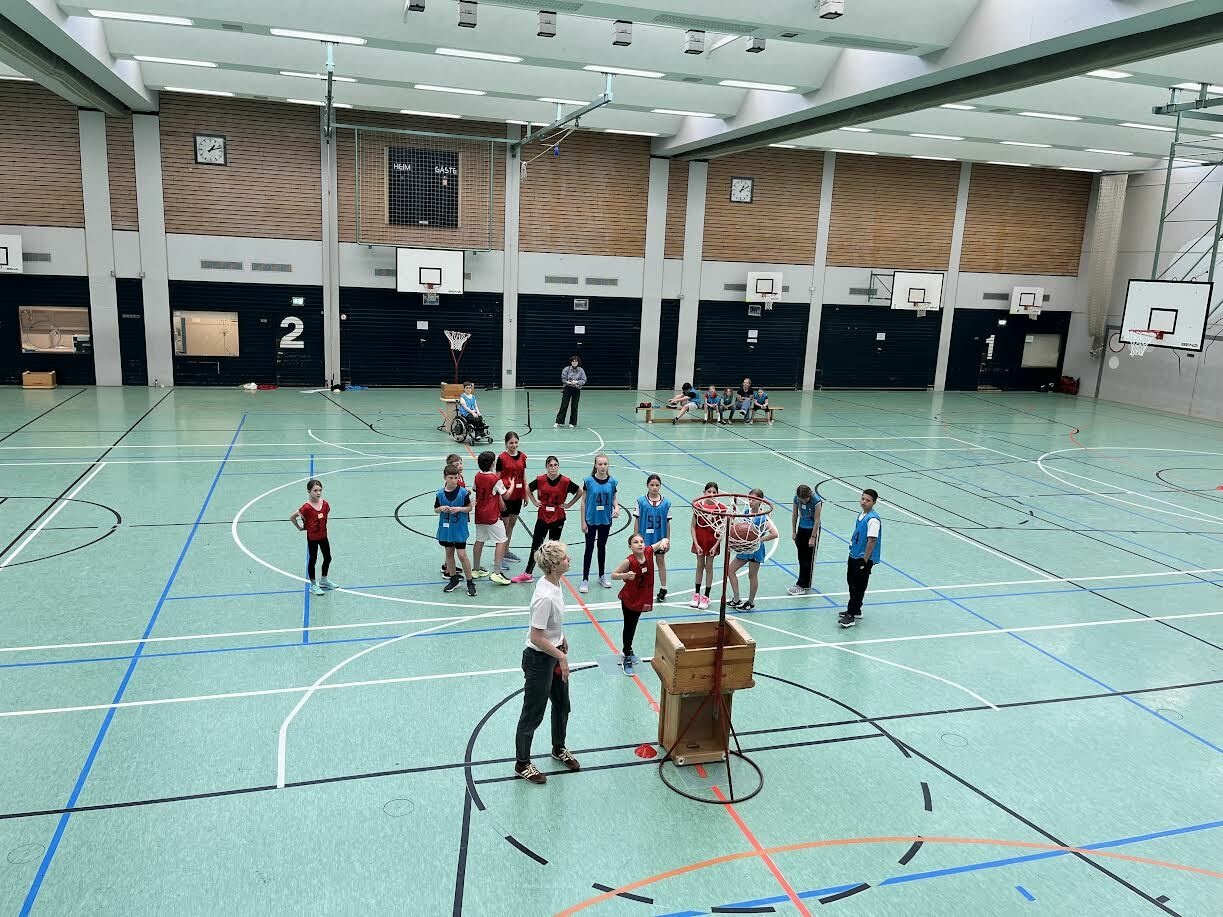 Am 15. und 22.4. bekam die Klasse R5b im Sportunterricht Besuch von Madita, Mila und Elise, die für das Team der „Blackforest Owls“ Baskin spielen. Nach dem Aufwärmen erklärten sie zunächst die Spielregeln:Baskin ist eine inklusive Variante von Basketball, die so gestaltet ist, dass Menschen mit und ohne Behinderung gemeinsam in einem Team spielen können.
