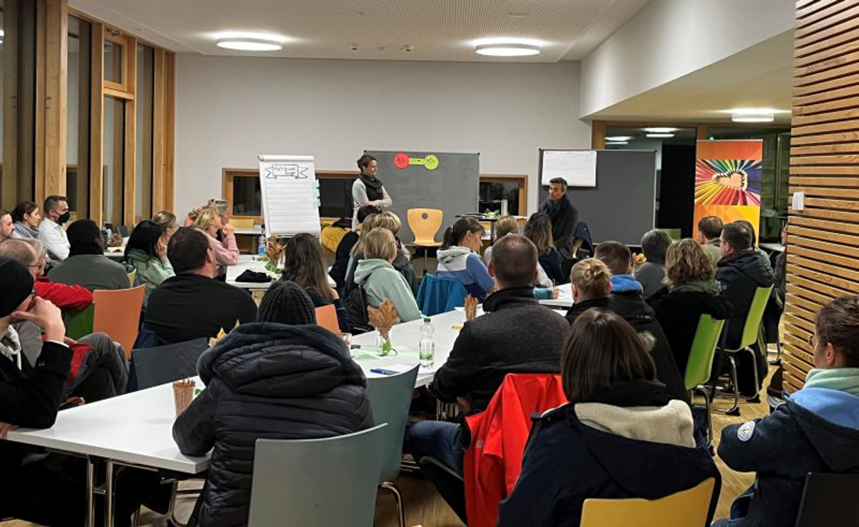 Über 50 interessierte Eltern folgten am 22.11.2023 der Einladung in die Mensa, um an einem Vortrag zum Thema „Neue Autorität“ teilzunehmen. Eingeladen hatten die Ruth-Cohn-Schule und das AWO-Familienzentrum.In lockerer Atmosphäre führten Regina Link und Rikki Brar durch den Abend, die beide aus dem Bereich der systemischen Beratung kommen. So wurde Fragen nachgegangen, die sich Eltern und Lehrkräfte im Alltag stellen: Wie können wir als System Schule gemeinsam mit dem System Familie gute Wege finden, um unsere Schülerinnen und Schüler respektive unsere Kinder zu unterstützen? Und wie können wir Erwachsene auf herausforderndes Verhalten der Jugendlichen lösungsorientiert reagieren?