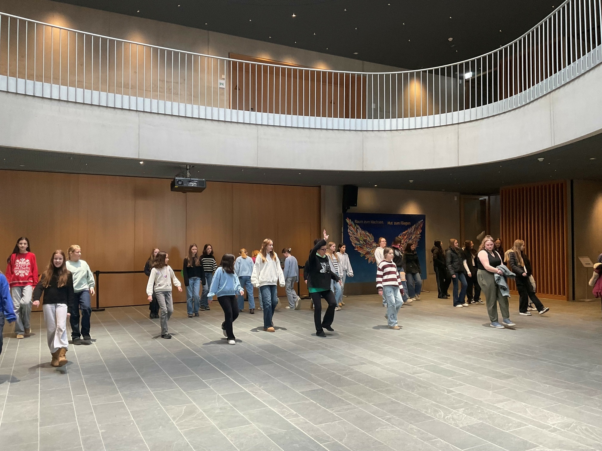 Getanzt wird in unserem neuen Foyer im Erdgeschoss. Treffpunkt ist immer zu Beginn der Pause. In diesem Schuljahr findet die Pause am Montag in der ersten und am Donnerstag in der zweiten Pause statt.